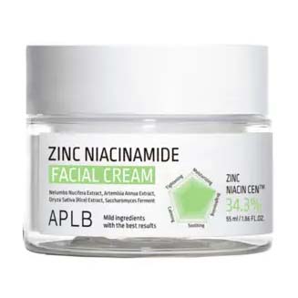 APLB Zinc Niacinamide Facial Cream controls sebum production to soothe irritation while brightening and moisturizing skin.